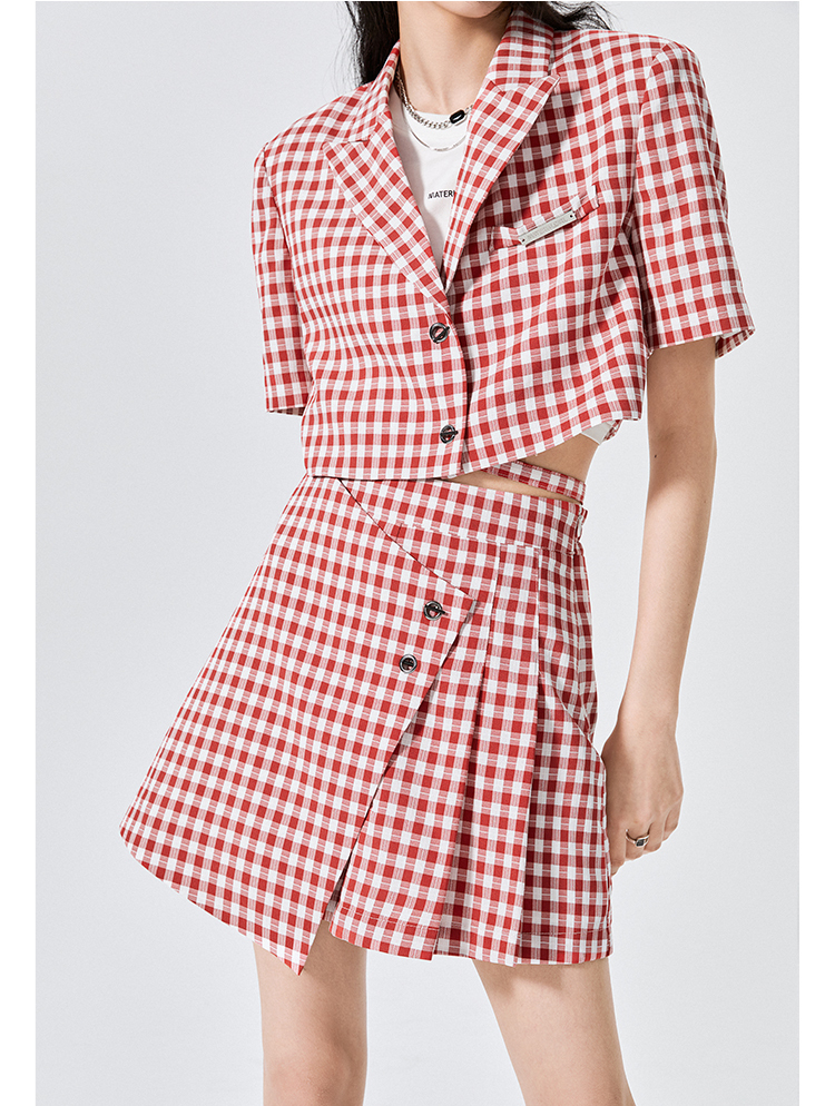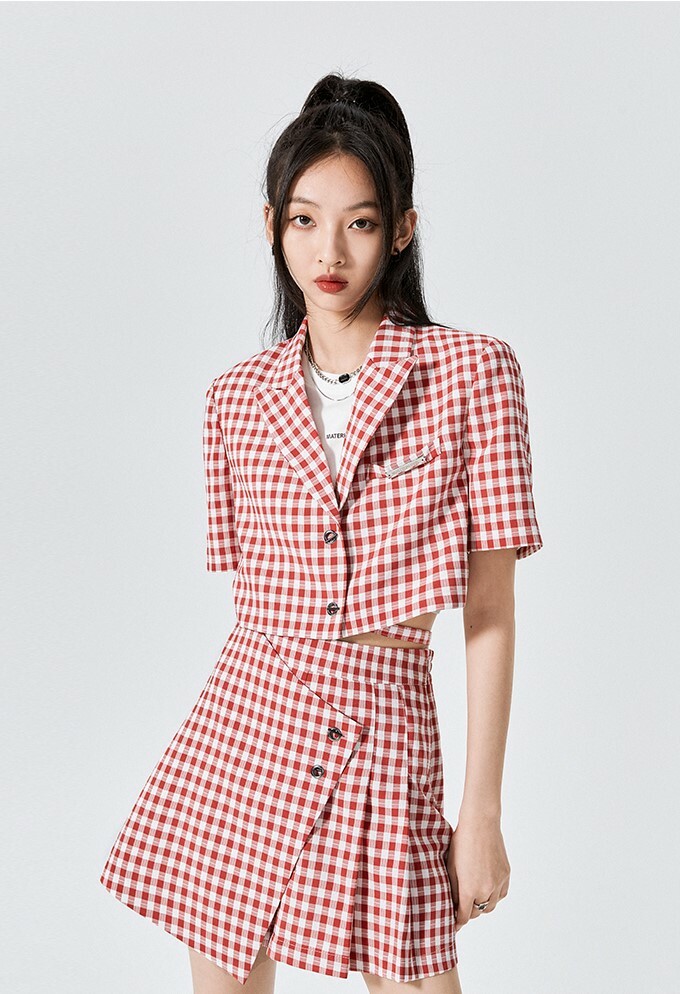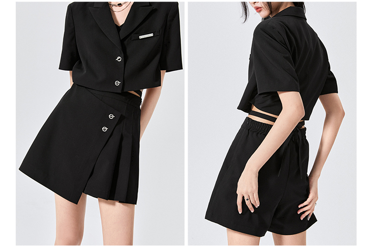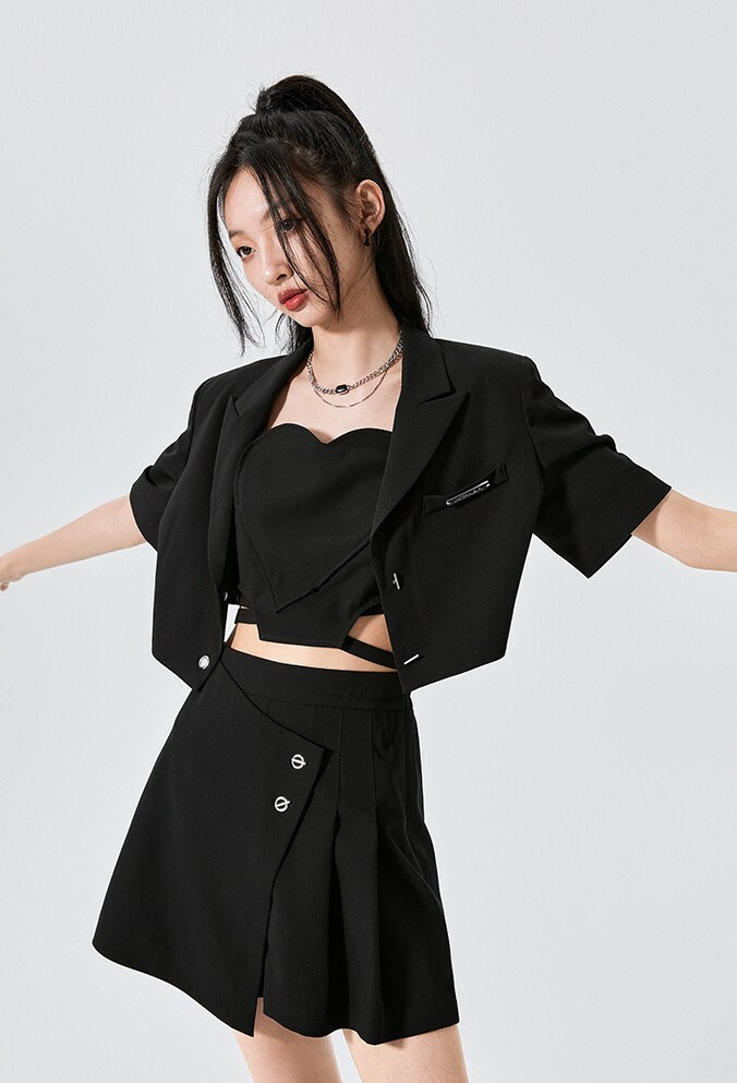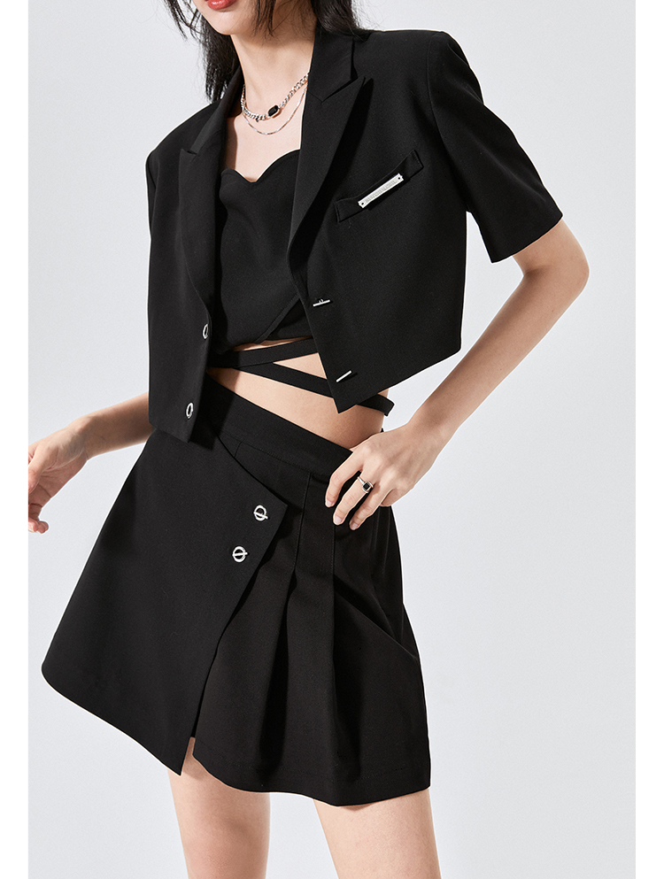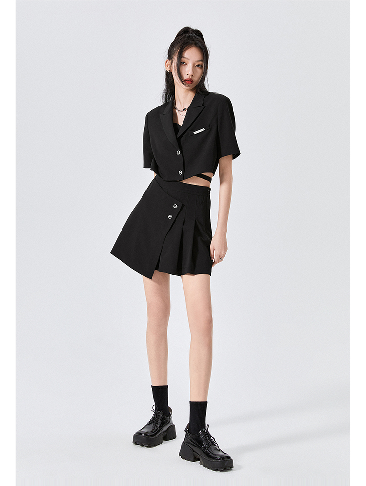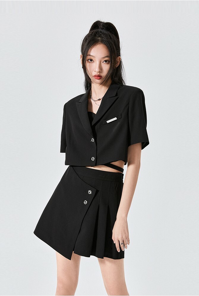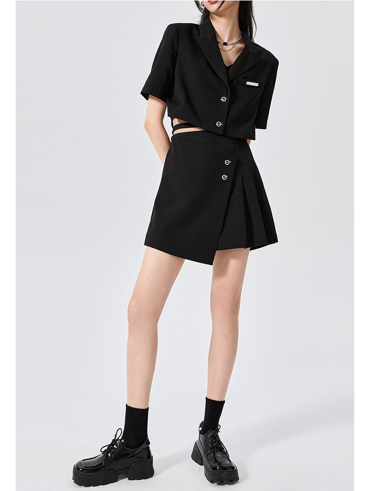 ABG短版綁帶西裝外套/不規則百褶褲裙(套裝)