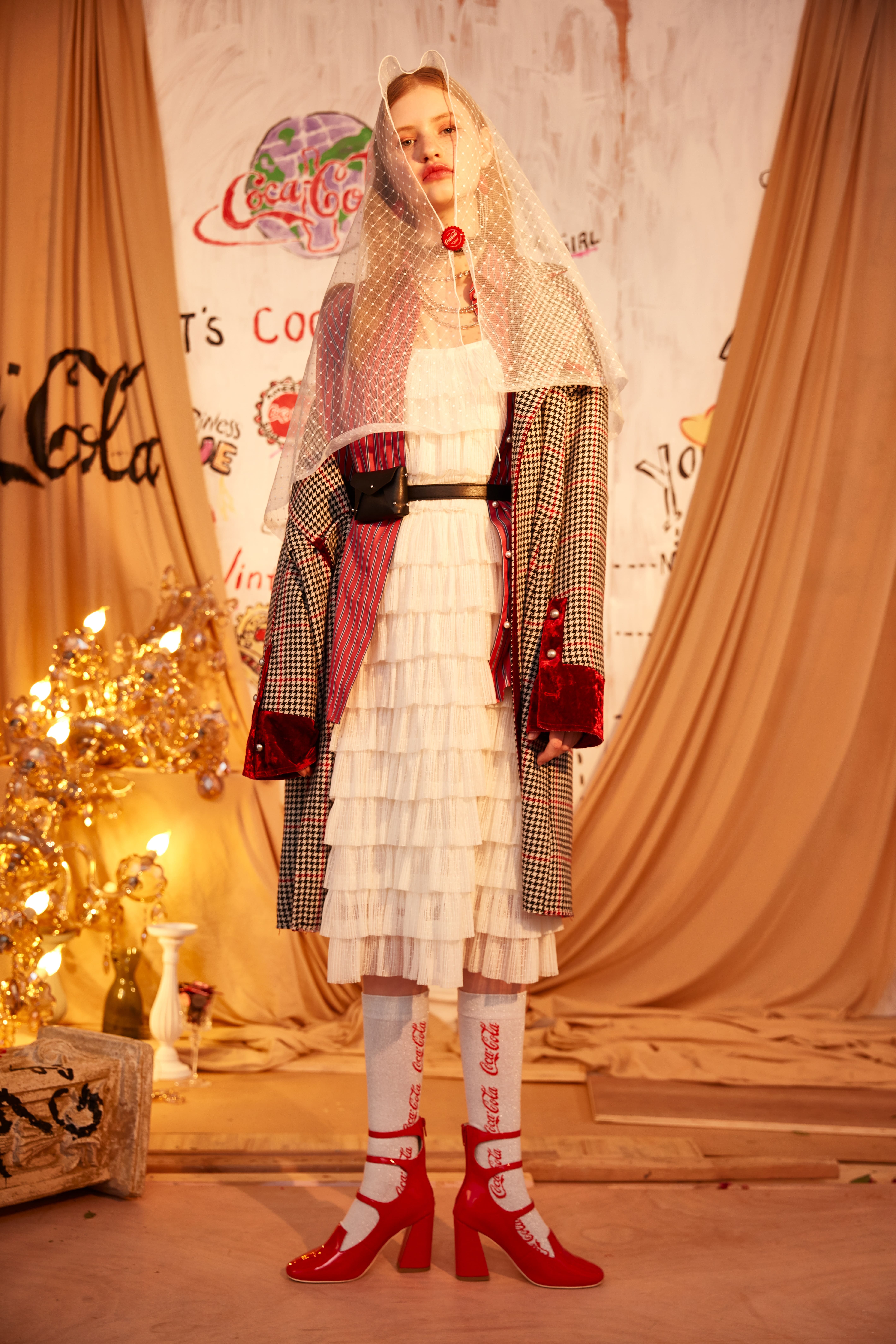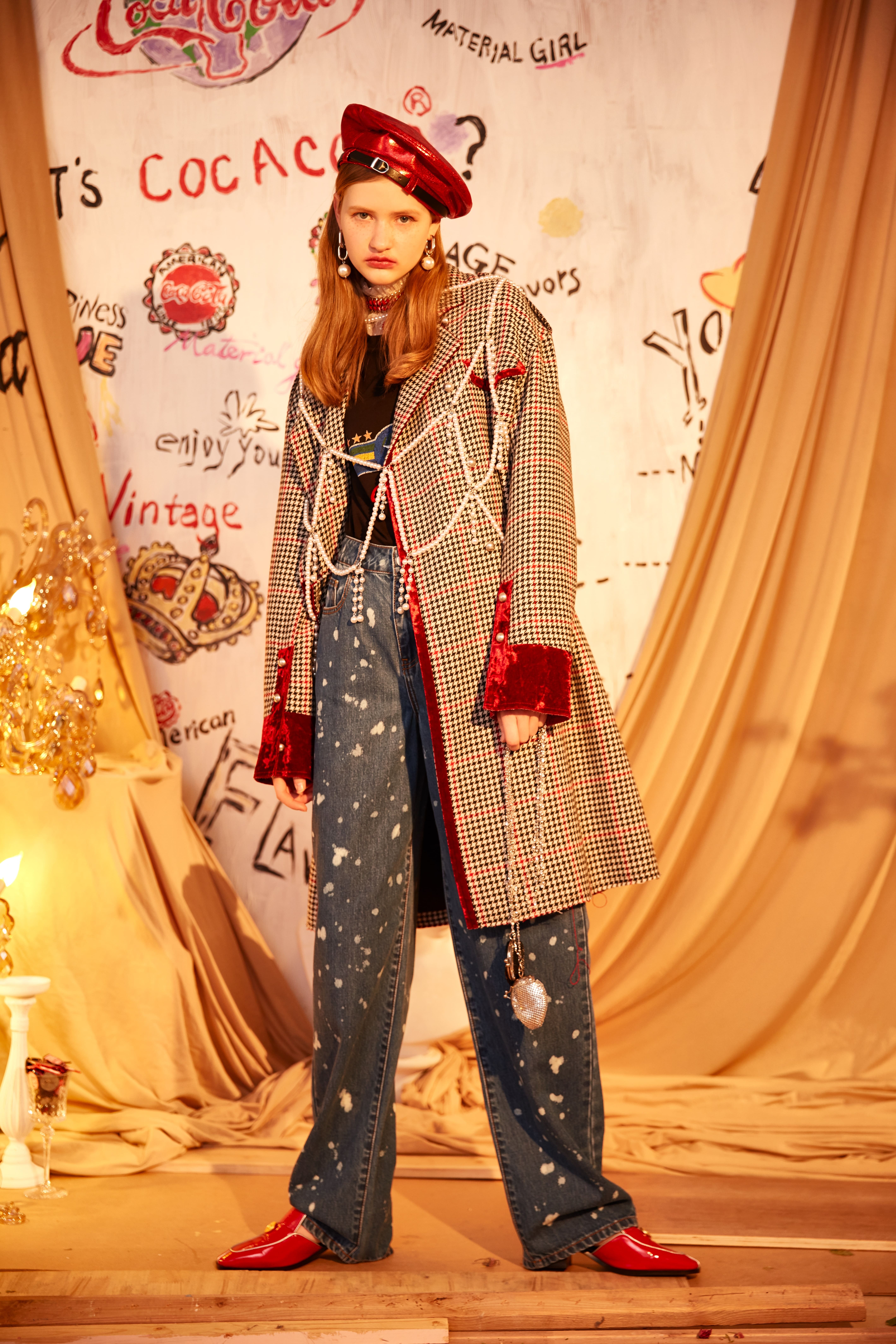 千鳥格紋拼接天鵝絨大衣外套