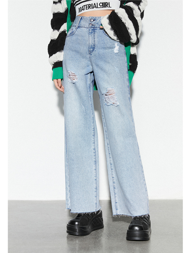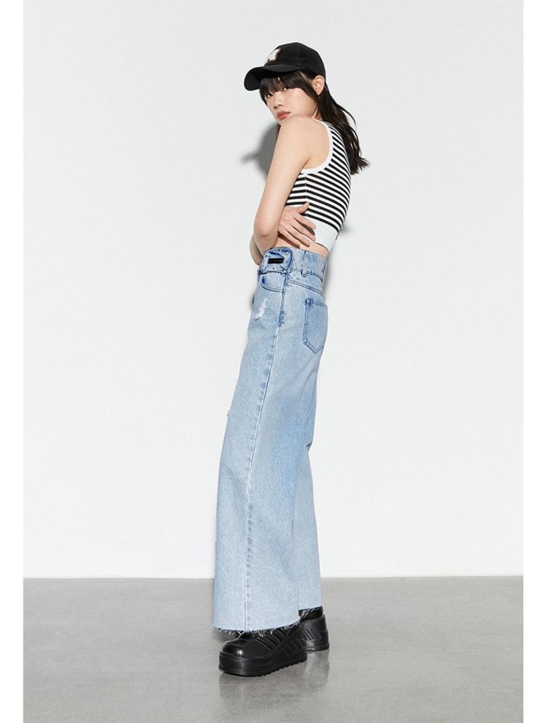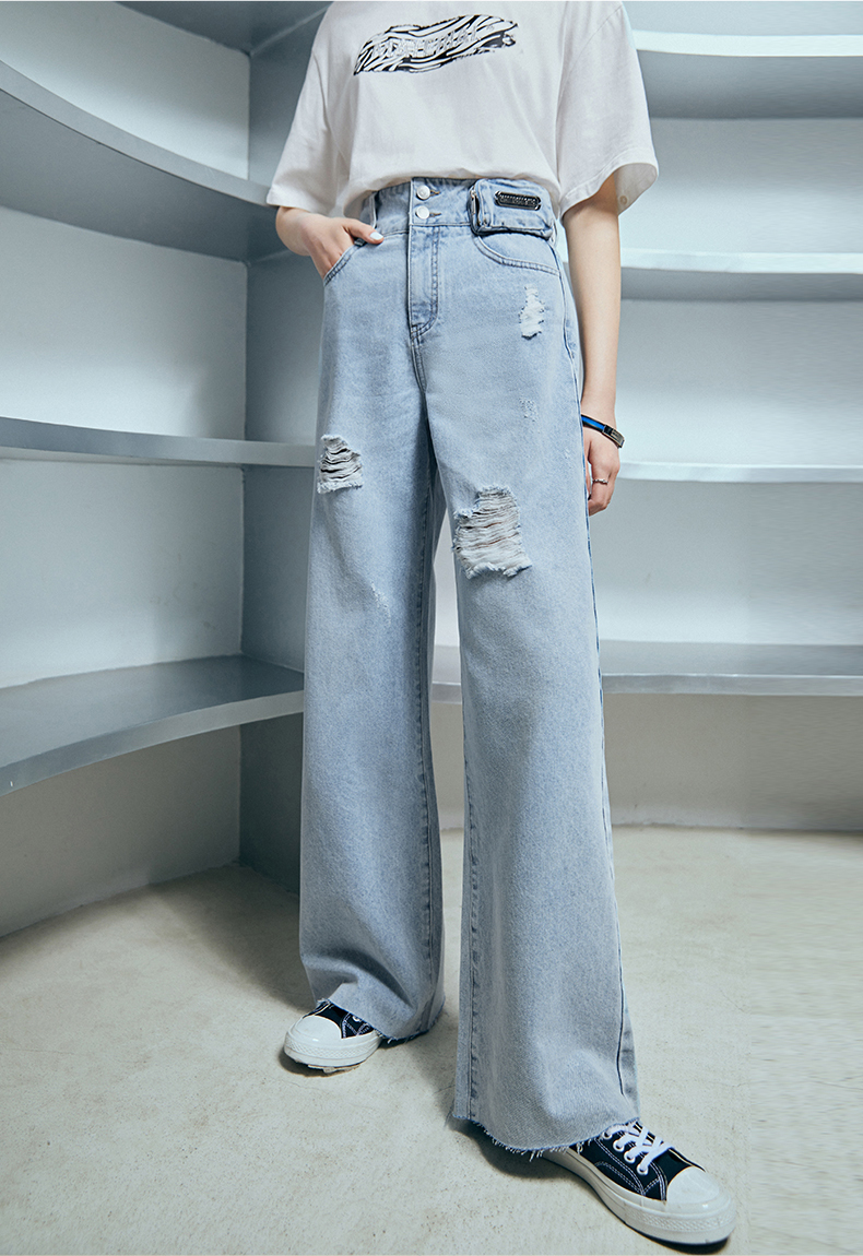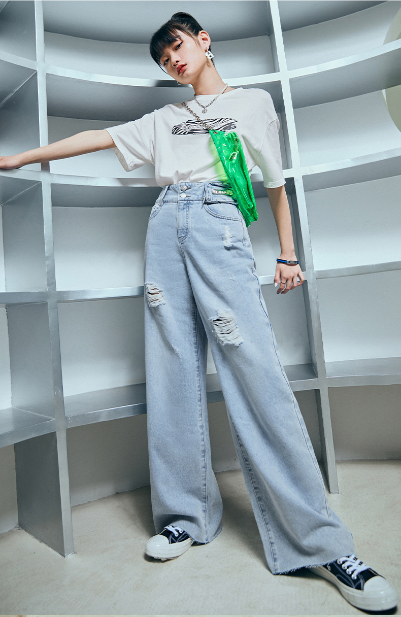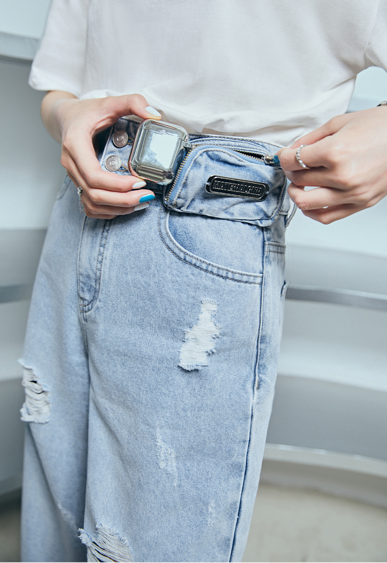 雙排釦腰包刷破牛仔寬褲