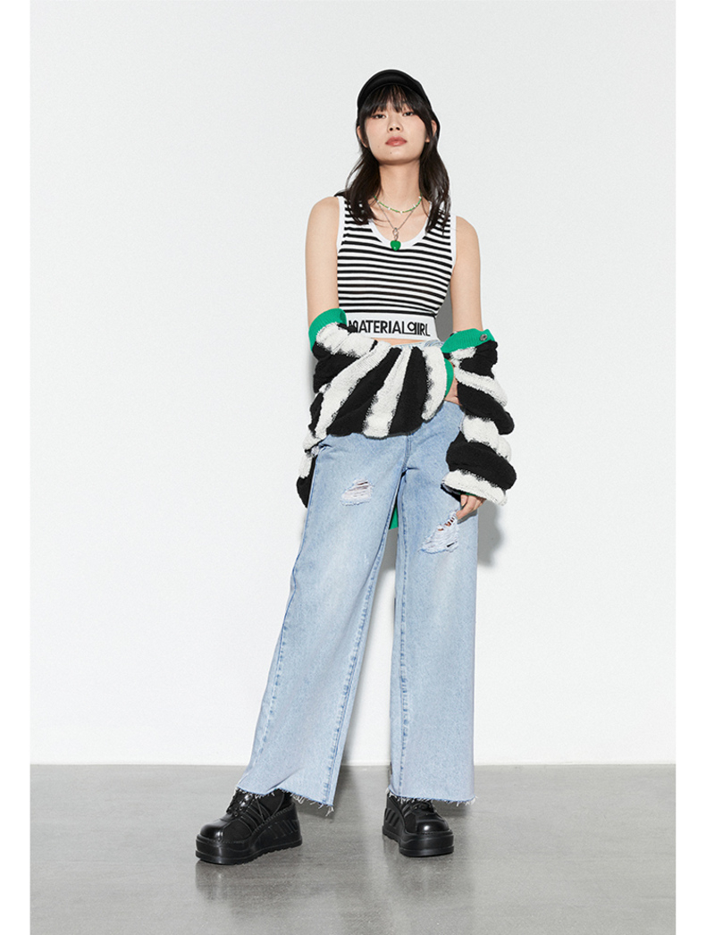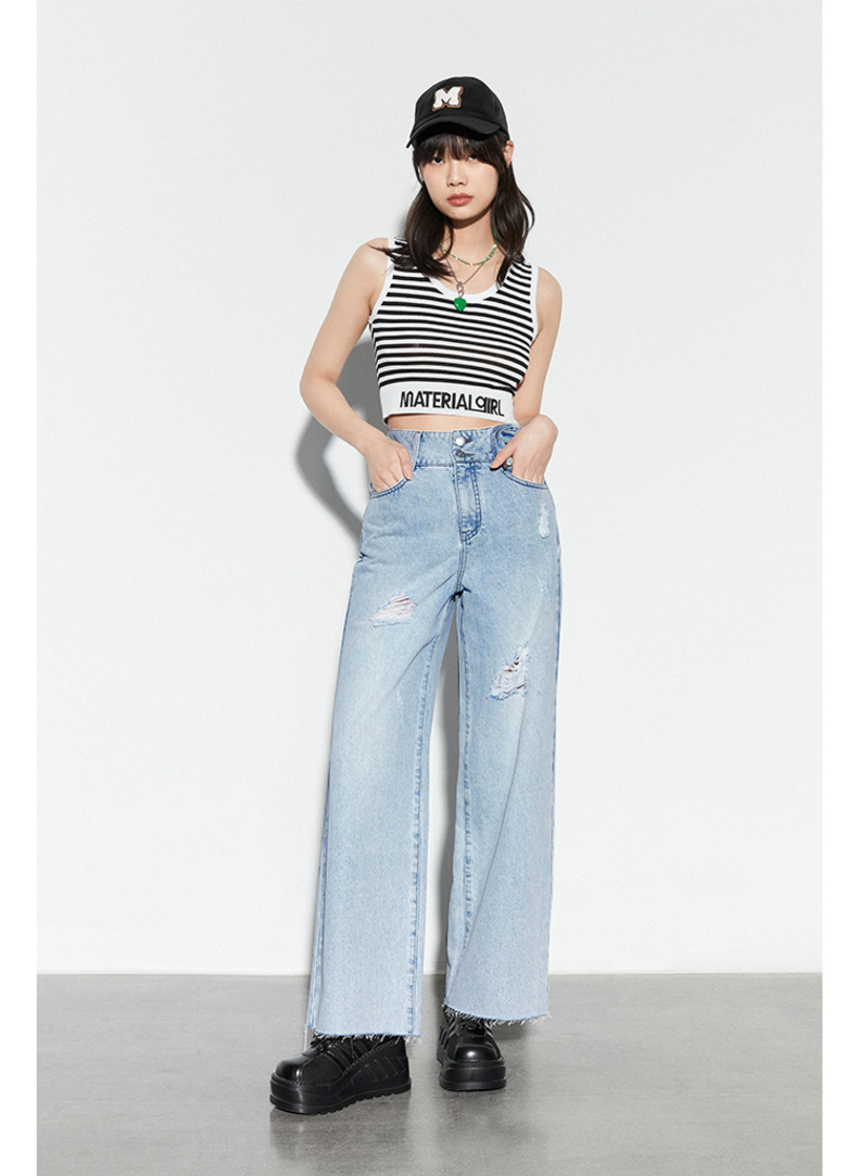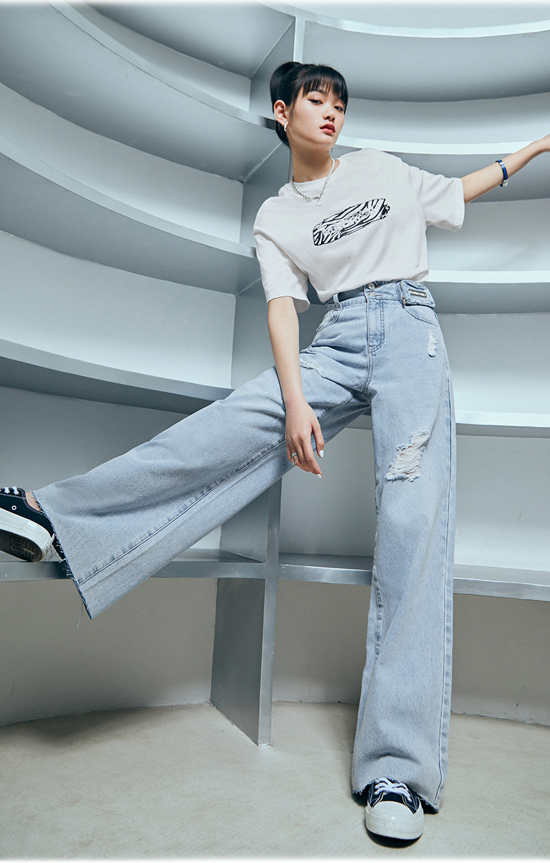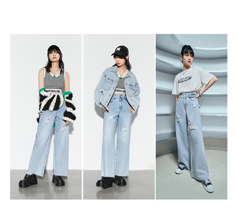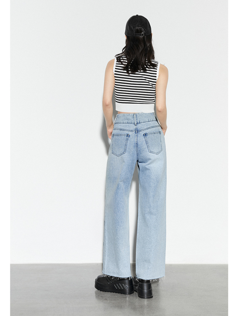 雙排釦腰包刷破牛仔寬褲
