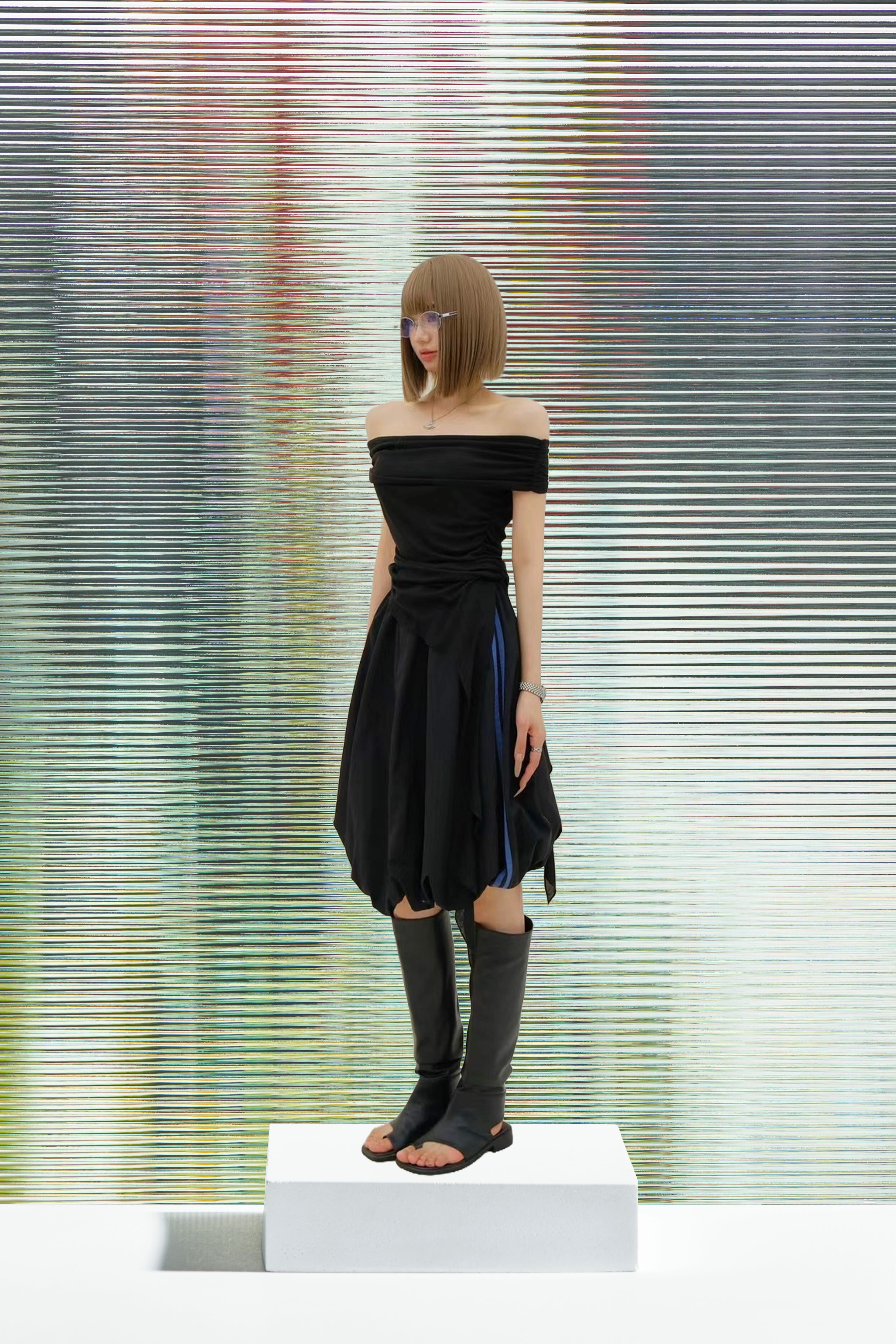 一字領不規則綁帶短袖上衣