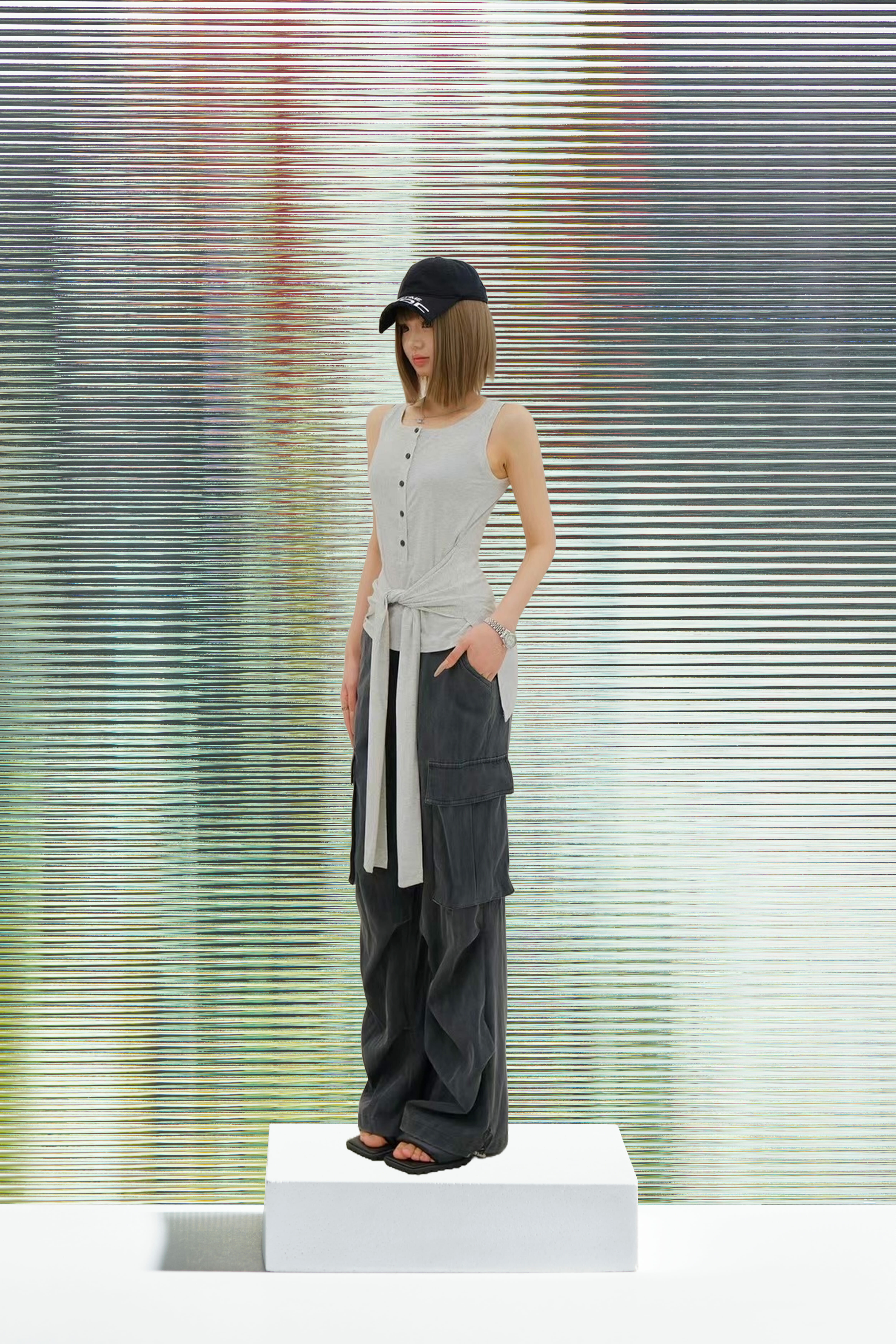 排釦造型綁帶長版棉質背心