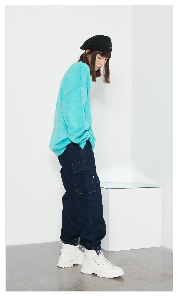 淘氣鬼雙褲頭拼接牛仔縮口長褲