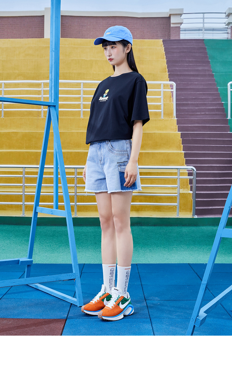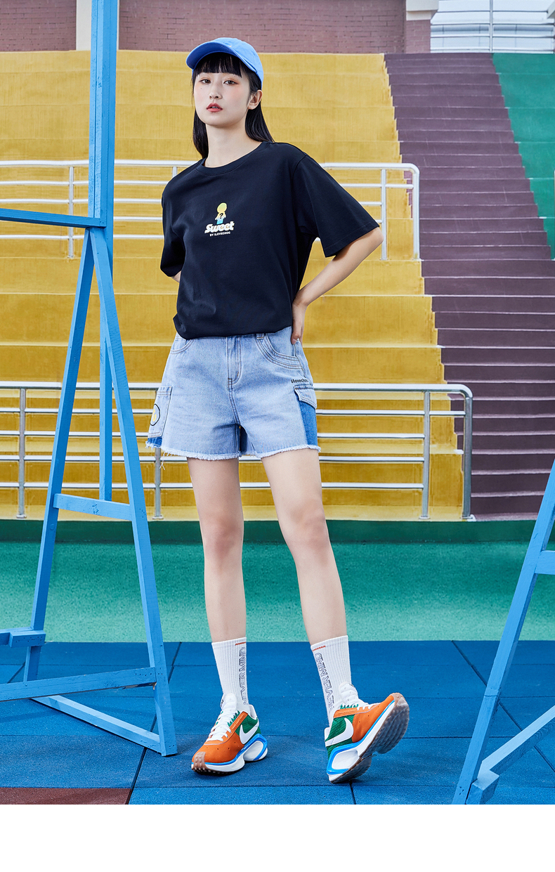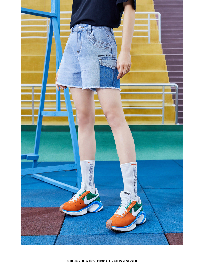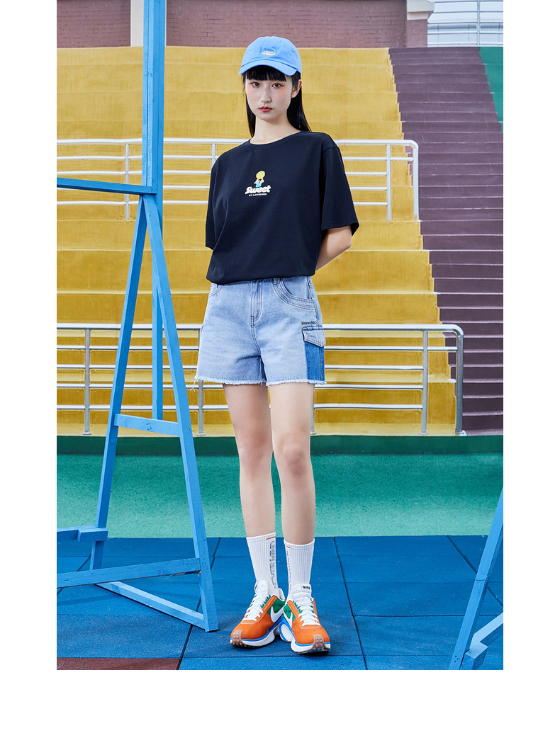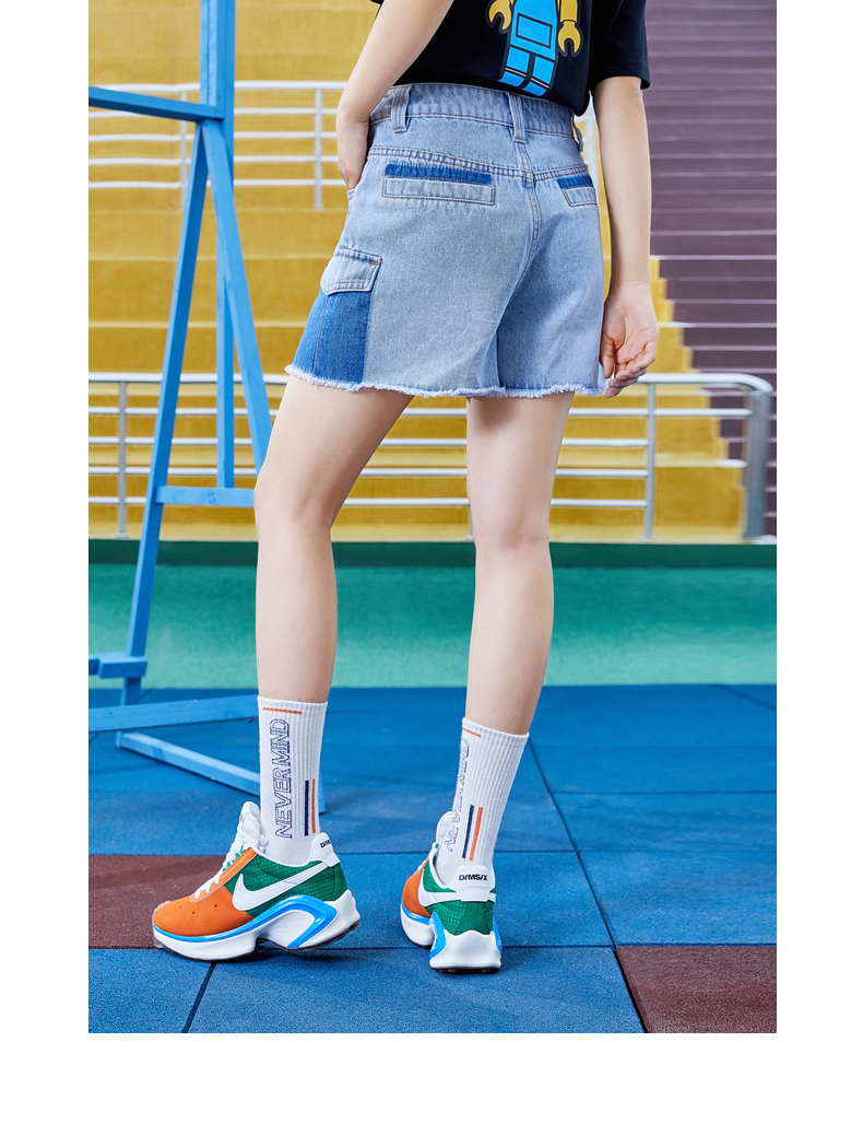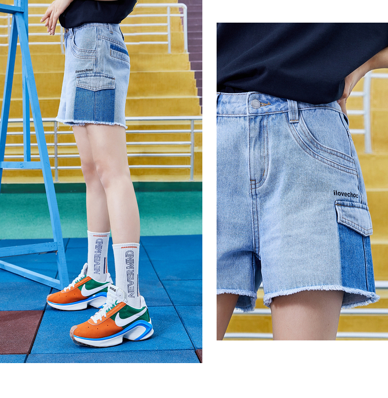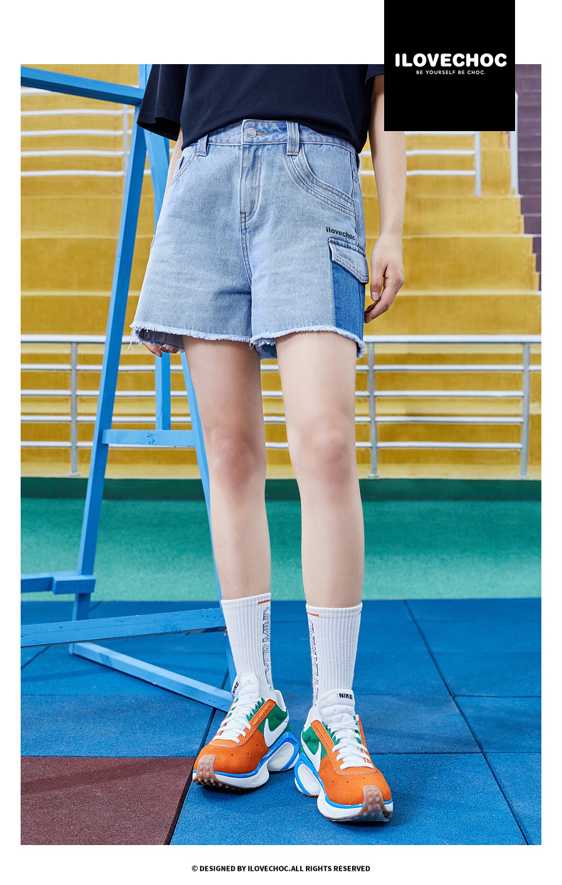 不對稱口袋毛邊牛仔短褲