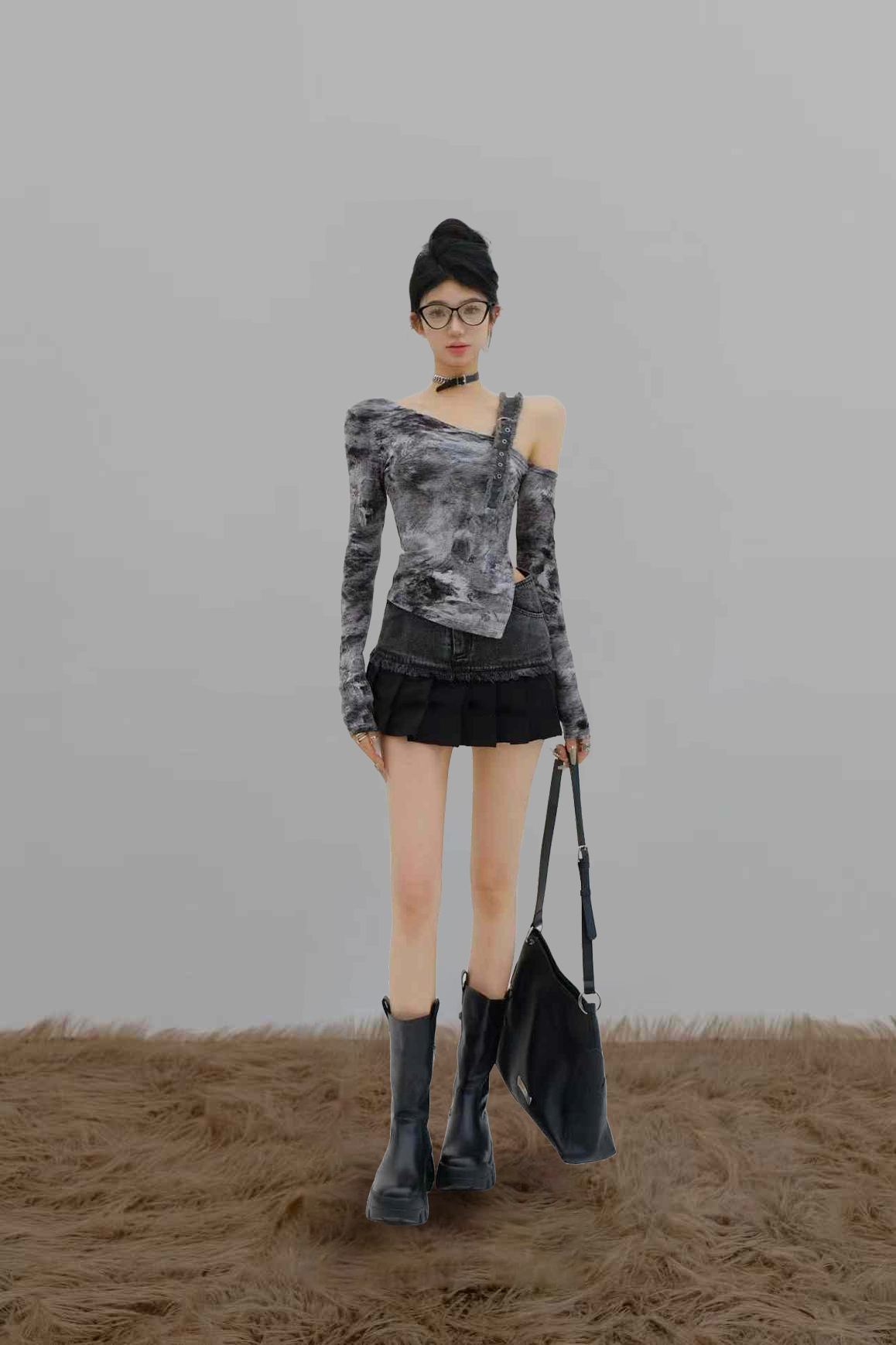 斜肩不規則剪裁抽鬚造型織帶長袖上衣